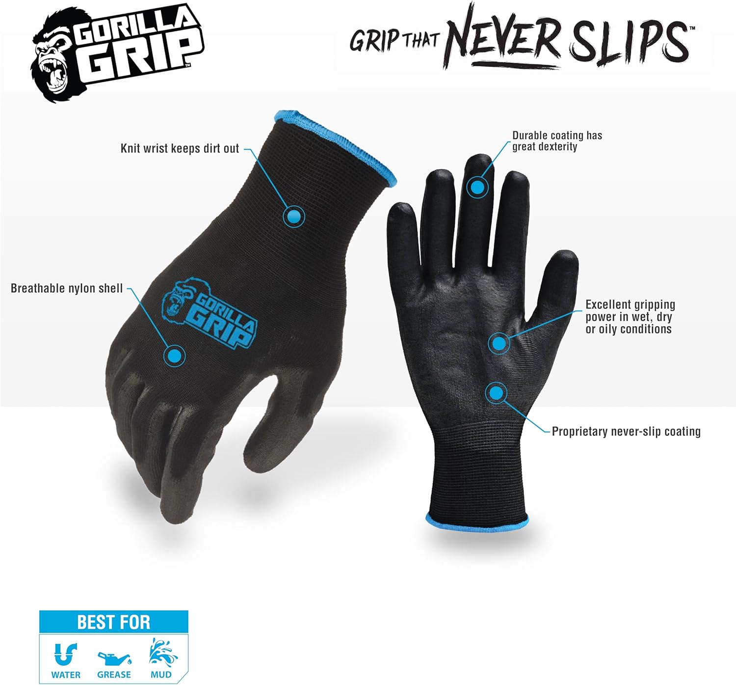 Gorilla Grip Work Gloves, Never Slip Maximum Grip All-Purpose, Gloves for Men, Superior in Wet, Dry, Oily Conditions, Polymer Palm, Large Size, 10 Pairs, Black/Blue | 25162-60