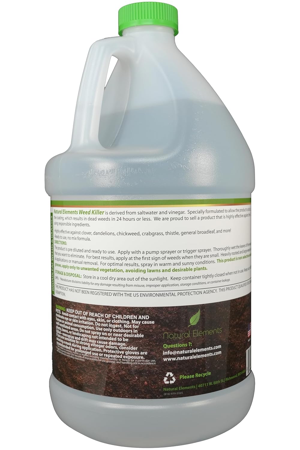 Natural Elements Weed Killer is an all natural and safe product formulated from salt water and highly concentrated commercial grade vinegars. Our product works FAST!!! Specially formulated to allow the product to stick to the leaf and strip the coating, which results in dead weeds in 24 hours or less. Results can be seen in as little as an hour, where most herbicides can take up to 5 days to begin to kill the weed.