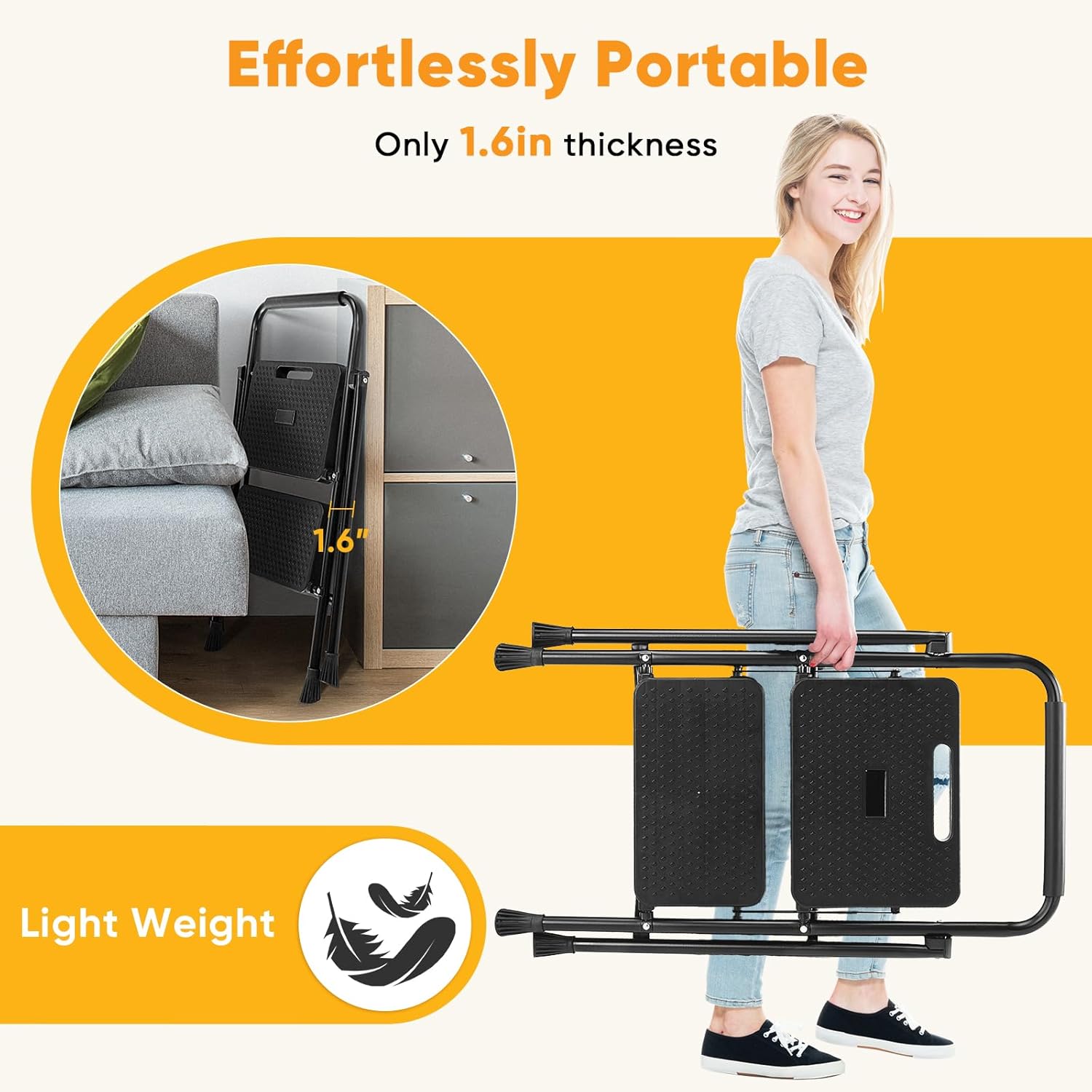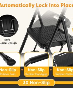 Easy to Fold: This step ladder 2 step folding is designed with a simple, user-friendly folding mechanism that lets you collapse it quickly. Its compact fold makes it easy to carry, store in tight spaces, or transport between rooms and job sites.