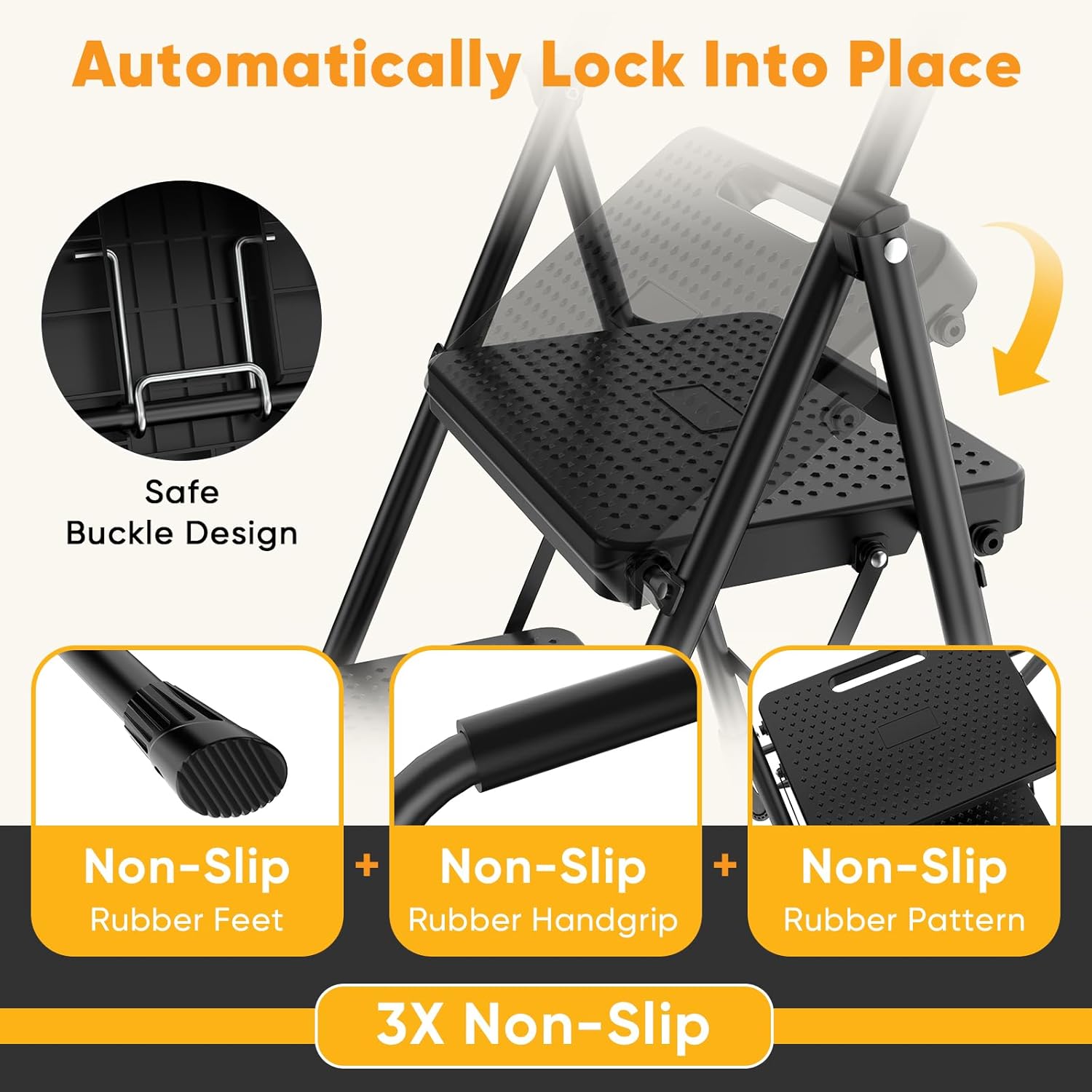 800 lbs Capacity 2 Step Ladder: Designed for both everyday tasks and tougher jobs, our 2 folding step stool offers a strong 800 lbs weight capacity without sacrificing stability. Its durable steel frame and slip-resistant steps provide a secure feel.