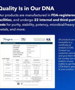 TESTED FOR SAFETY, POTENCY, AND PURITY – Tru Niagen is one of the most well-studied, patented, supplements. Our patented ingredient Niagen has achieved regulatory acceptance by the US FDA for use in supplements: twice as an NDI (New Dietary Ingredient), and once as GRAS (Generally Recognized As Safe). Every batch is made in the United States with globally sourced ingredients and third-party tested by ISO/IEC accredited labs for potency, safety, and purity. Tru Niagen NAD+ capsules are vegetarian, gluten free, nut free, caffeine free, and have no artificial flavors or colors.