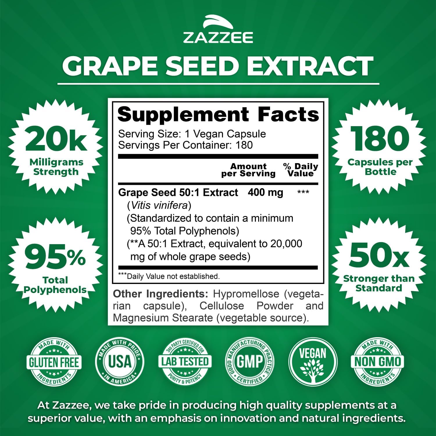 GOLD STANDARD PRODUCTION: Your health and safety mean everything to us. For that reason, our Extra Strength Grape Seed Extract is manufactured in the USA, in a fully certified facility with adherence to good manufacturing policies and under the most stringent quality control. You can rest assured that you get the best value for your money!